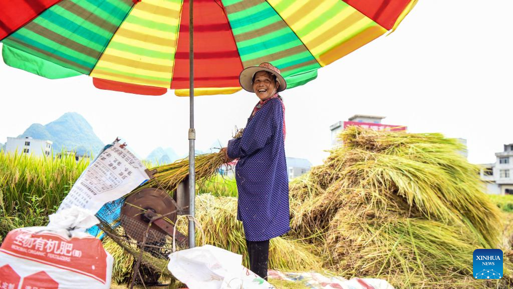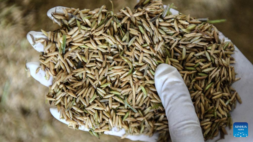 An agricultural technician checks the quality of the newly-harvested rice in Longkou Village, Dahua Yao Autonomous County, south China's Guangxi Zhuang Autonomous Region, July 20, 2022. (Xinhua/Zhang Ailin)