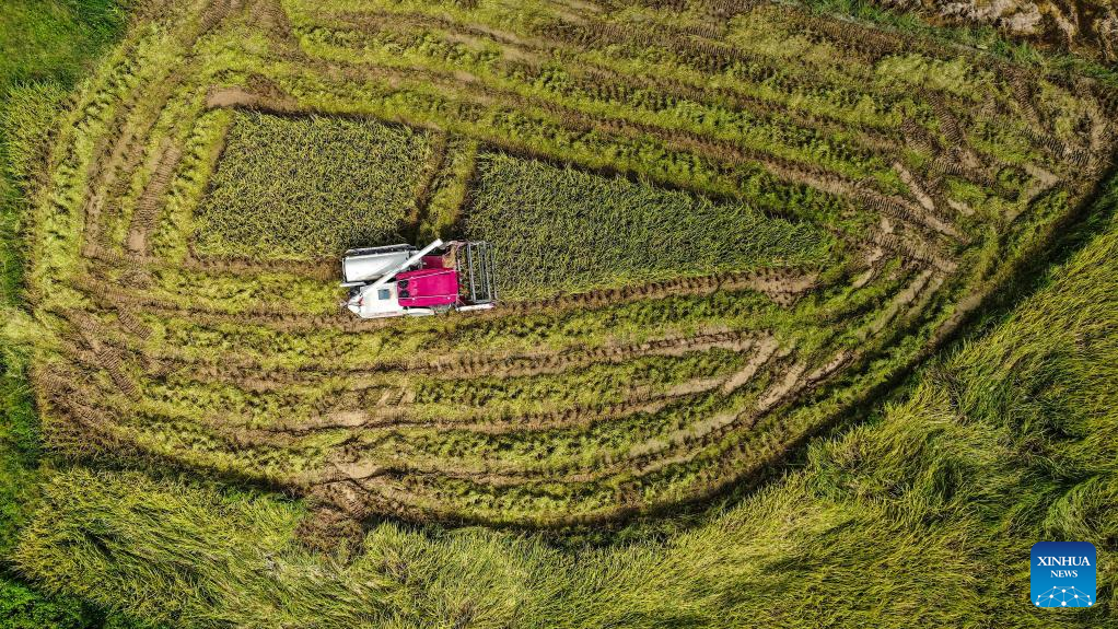 Aerial photo shows farmers working in a paddy field in Longkou Village, Dahua Yao Autonomous County, south China's Guangxi Zhuang Autonomous Region, July 20, 2022. (Xinhua/Zhang Ailin)