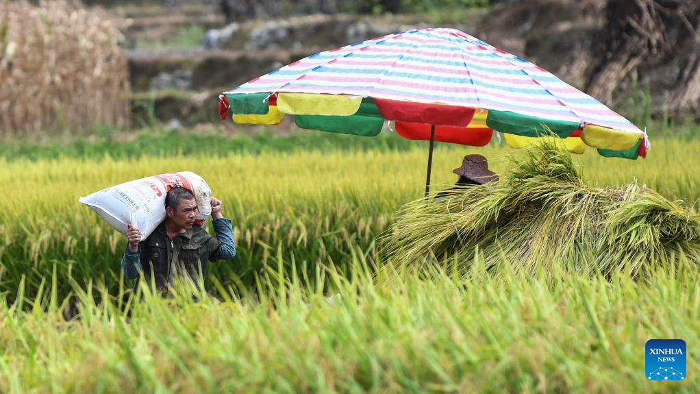 Farmers work in paddy fields in Longkou Village, Dahua Yao Autonomous County, south China's Guangxi Zhuang Autonomous Region, July 20, 2022. (Xinhua/Zhang Ailin)