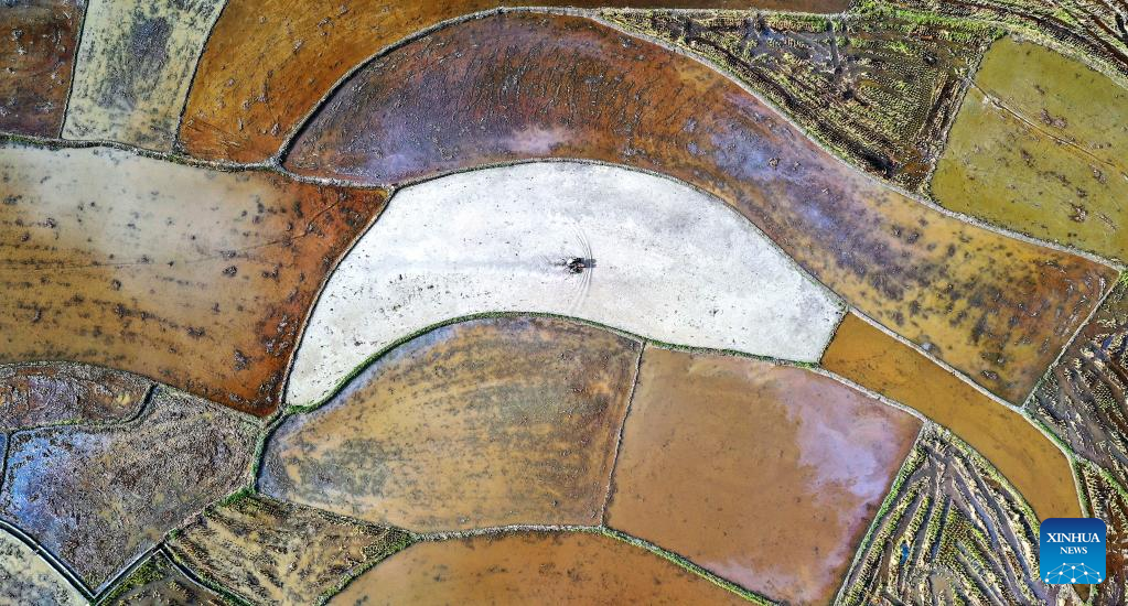 Aerial photo shows a farmer working in a paddy field in Longkou Village, Dahua Yao Autonomous County, south China's Guangxi Zhuang Autonomous Region, July 20, 2022. (Xinhua/Zhang Ailin)
