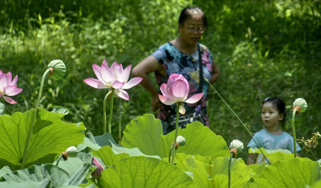 People look at lotus flowers at Yuanmingyuan Park in Beijing, capital of China, July 20, 2022. (Xinhua/Li Xin)
