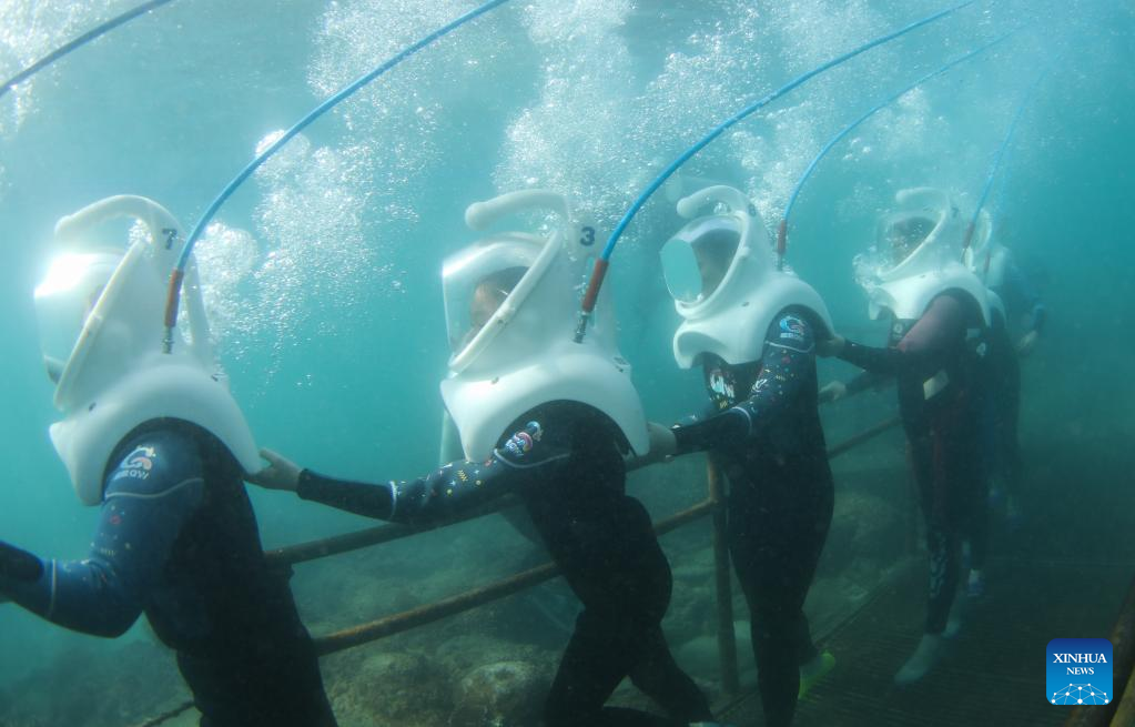Tourists advance in "undersea walking" in the sea area of Wuzhizhou Island in Sanya, south China's Hainan Province, Jan. 11, 2020. (Xinhua/Yang Guanyu)