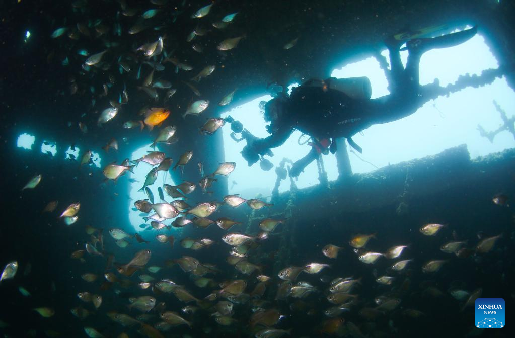 A diver takes photos of the fish at a marine ranch of the Wuzhizhou Island scenic area in Sanya, south China's Hainan Province, May 21, 2021. (Xinhua/Yang Guanyu)