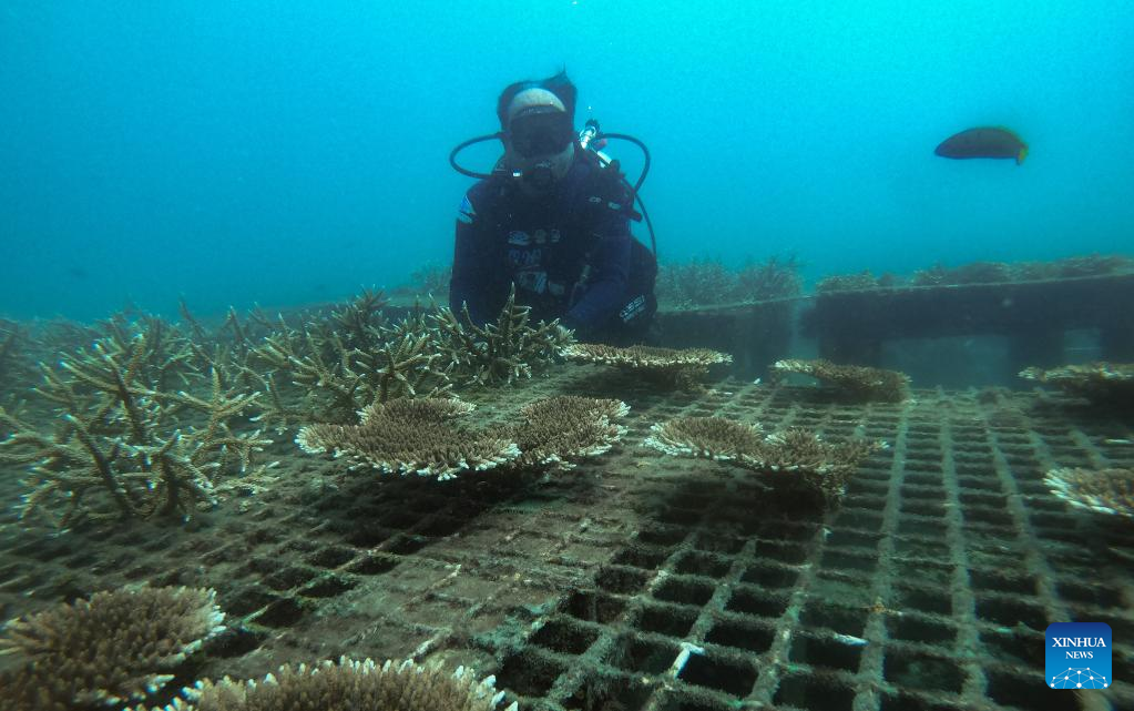 Photo taken on April 29, 2020 shows corals at a marine ranch in the sea area of Wuzhizhou Island in Sanya, south China's Hainan Province. (Xinhua/Yang Guanyu)