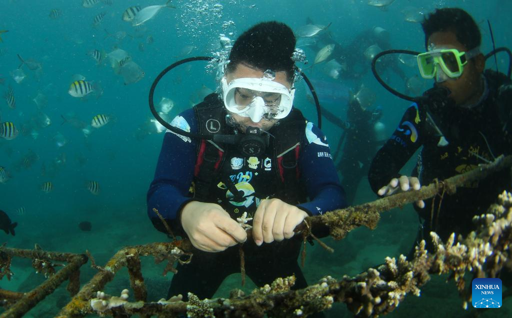 Tourists transplant corals near Wuzhizhou Island of Sanya, south China's Hainan Province, Jan. 30, 2022. (Xinhua/Yang Guanyu)