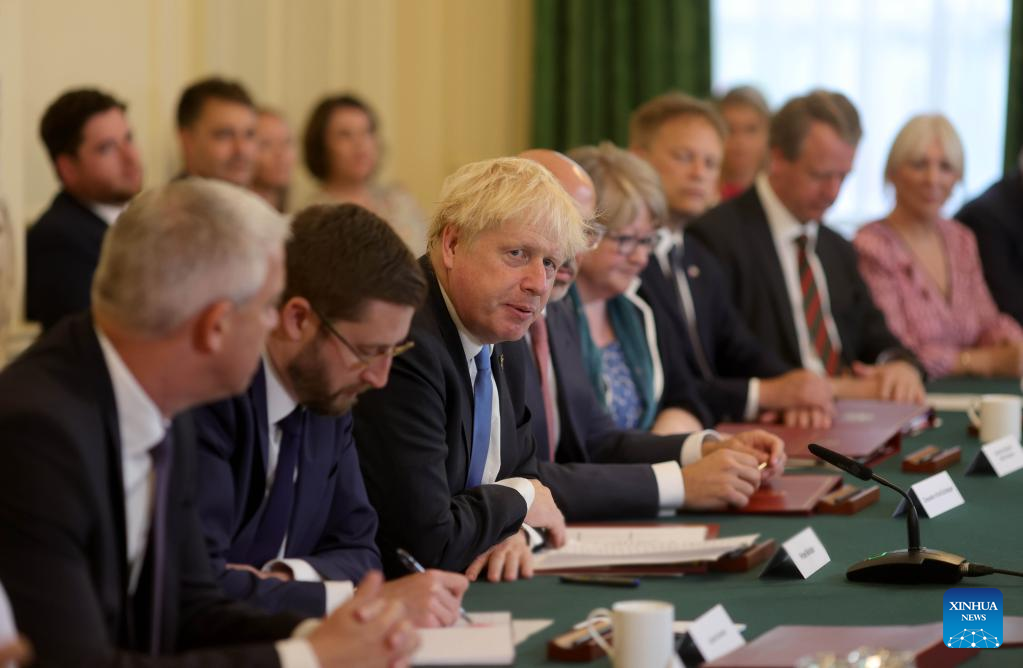Outgoing British Prime Minister Boris Johnson (3rd L, front) chairs his last cabinet meeting in the cabinet room at 10 Downing Street in London, Britain, July 19, 2022. (Andrew Parsons/No. 10 Downing Street/Handout via Xinhua)