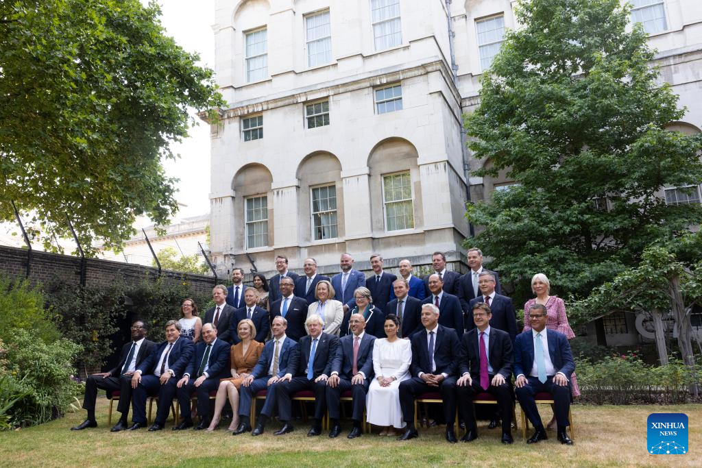 Outgoing British Prime Minister Boris Johnson (3rd R, front) and members of the Cabinet pose for a group photo in the garden of 10 Downing Street in London, Britain, July 19, 2022. (Simon Dawson/No. 10 Downing Street/Handout via Xinhua)