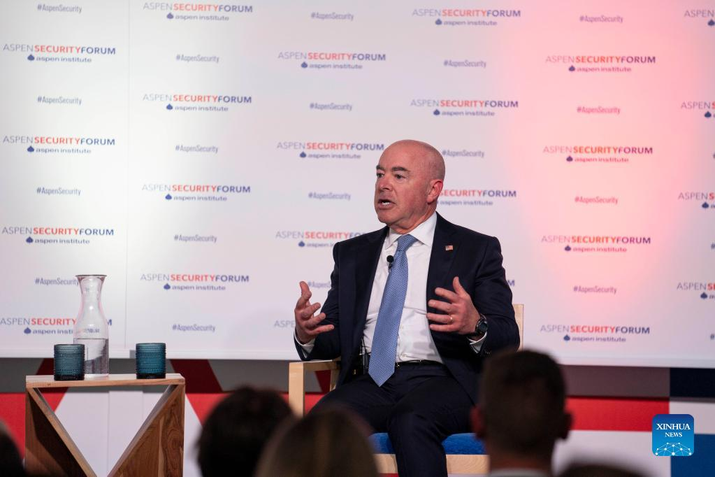 U.S. Secretary of Homeland Security Alejandro Mayorkas speaks during a discussion of the Aspen Security Forum in Aspen, Colorado, the United States on July 19, 2022. Calling divisiveness one of the many threats facing the United States, Mayorkas on Tuesday blamed the growing divide on the unprecedented high degree of tolerance for hate in the country. (Xinhua/Liu Jie)