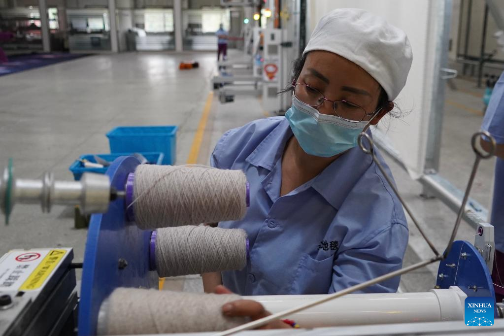 A worker makes Tibetan carpet at a factory in Xining, northwest China's Qinghai Province, July 8, 2022.