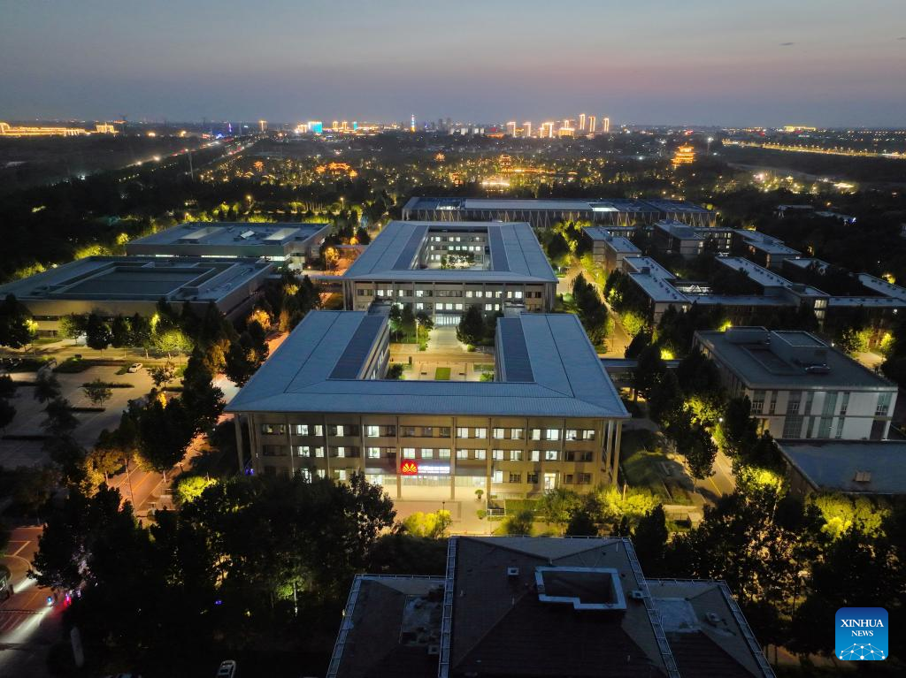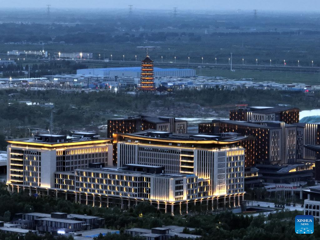 Aerial photo taken on July 20, 2022 shows a night view of the business service center in Xiong'an New Area, north China's Hebei Province. (Xinhua/Xing Guangli)