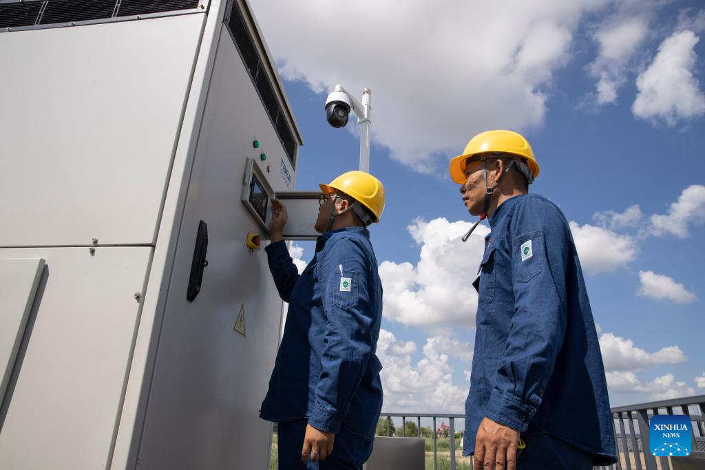 Staff members check auxiliary equipment at the site of the Xinghuo Water Surface Photovoltaic Demonstration Project of Daqing Oilfield in Daqing, northeast China's Heilongjiang Province, July 21, 2022.