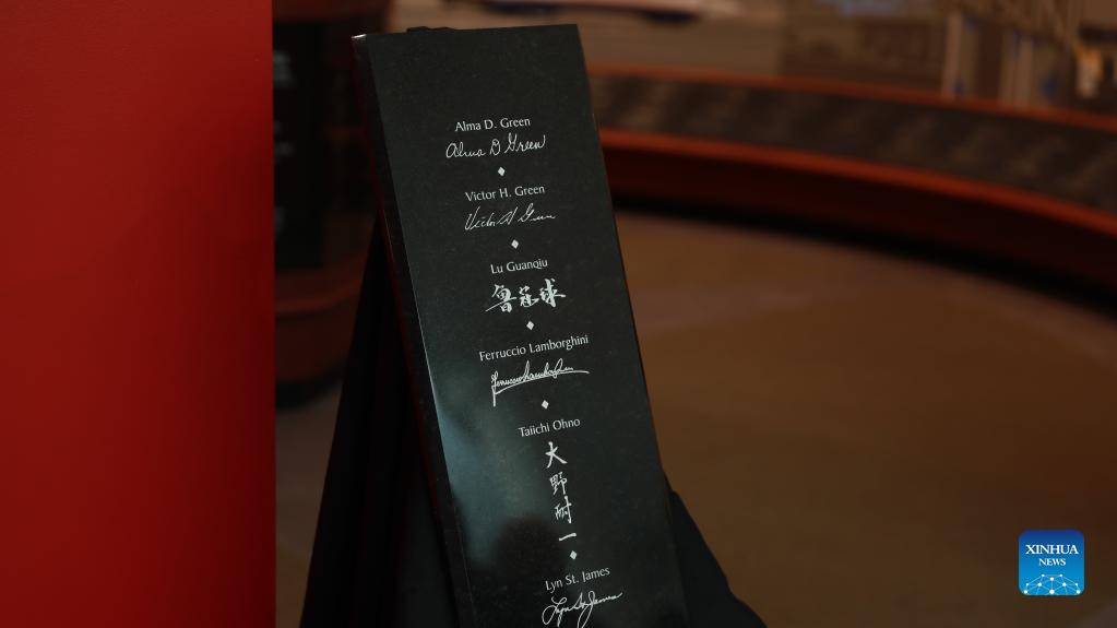 A marble plaque bearing the signatures of Lu Guanqiu and five other inductees is on display before the installation into the Hall of Honor at the U.S. Automotive Hall of Fame in Detroit, the United States, on July 20, 2022. Lu Guanqiu, founder of Chinese privately owned Wanxiang Group, has become the first Chinese who is inducted into the U.S. Automotive Hall of Fame (AHF). A marble plaque bearing the signatures of Lu and five other inductees was installed into the Hall of Honor at the U.S. AHF in Detroit Wednesday night. (Xinhua/Zhang Mocheng)