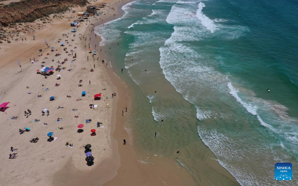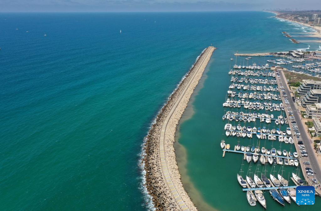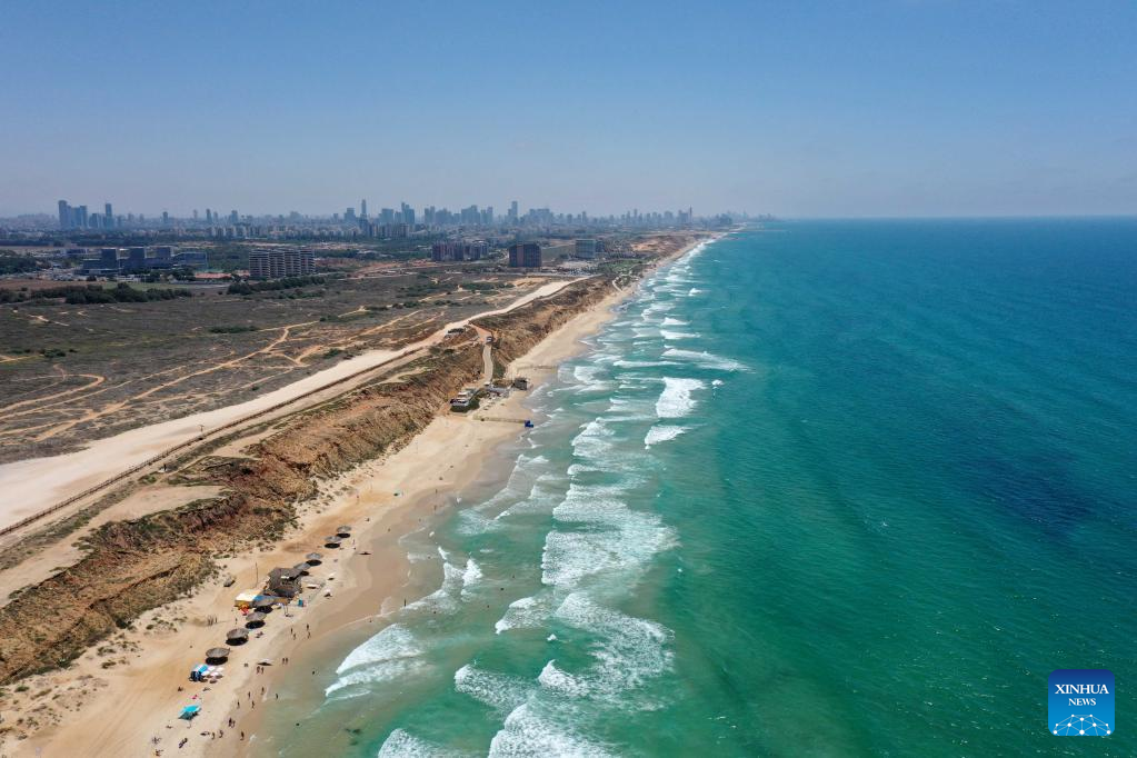 Aerial photo taken on July 20, 2022 shows the shore of Mediterranean Sea at Israeli city of Herzliya near Tel Aviv, Israel. (Photo by Gil Cohen Magen/Xinhua)