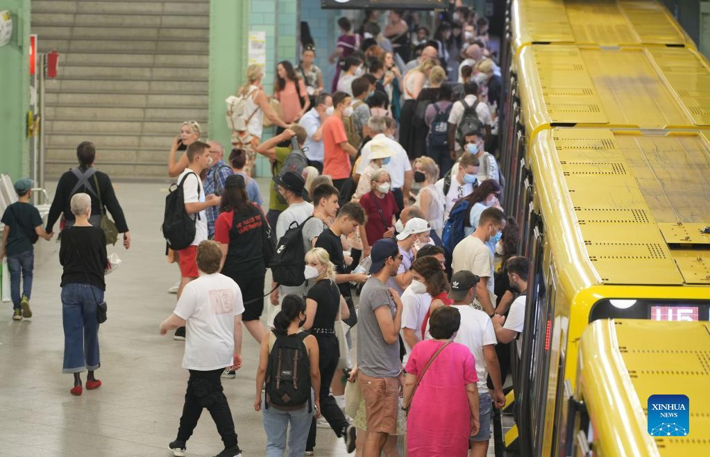 Passengers are seen at a subway station in Berlin, Germany, on July 21, 2022. Germany registered 136,624 new COVID-19 infections on Thursday, bringing the total count to over 30 million cases. Thursday's figure was around 16,000 less than a week ago, the Robert Koch Institute has said. (Photo by Stefan Zeitz/Xinhua)