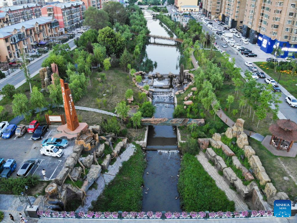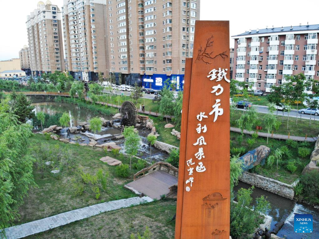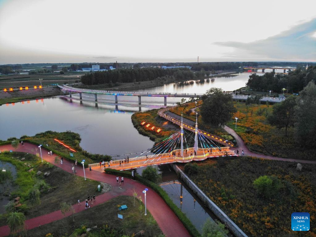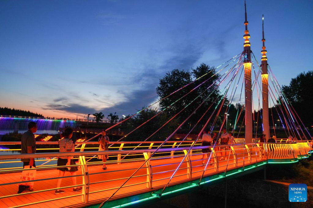 People enjoy themselves in a waterscape scenic area in Tieli City, northeast China's Heilongjiang Province, July 21, 2022. In recent years, Tieli City has worked on water pollution control and water project construction, providing local residents with improved living environment. (Xinhua/Wang Song)