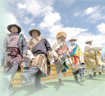 Zang people perform the Guozhuang dance, a traditional dance, during a tourism and culture festival held in Burang county, Ngari prefecture in Xizang Autonomous Region in southwest China. (Photo by Chungdak Drolkar and Konchok Chophel)