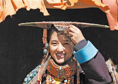Photo shows a woman from Khorchak village in a traditional “Xuan” costume. As the most representative clothing culture of Khorchak village, there are only eight sets of well-preserved “Xuan” costumes in the locality, with each set weighing over 20 kilograms. The “Xuan” costume is a national-level intangible cultural heritage in China. (Photo by Chungdak Drolkar and Konchok Chophel)