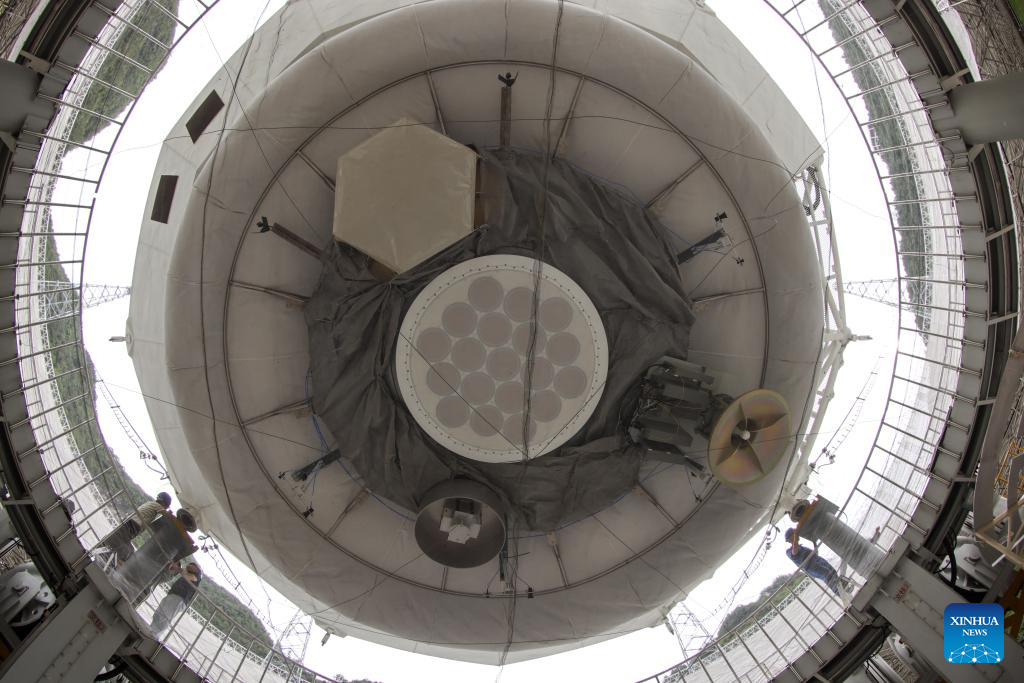 Photo taken on July 21, 2022 shows China's Five-hundred-meter Aperture Spherical Radio Telescope (FAST) under maintenance in southwest China's Guizhou Province. Using FAST, also dubbed as the "China Sky Eye," scientists have identified over 660 new pulsars since October 2017. (Xinhua/Ou Dongqu)