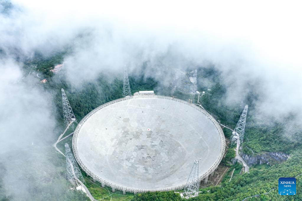 Aerial photo taken on July 21, 2022 shows China's Five-hundred-meter Aperture Spherical Radio Telescope (FAST) under maintenance in southwest China's Guizhou Province. Using FAST, also dubbed as the "China Sky Eye," scientists have identified over 660 new pulsars since October 2017. (Xinhua/Ou Dongqu)