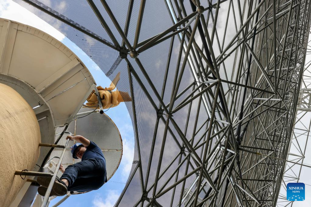 A staff member performs a regular maintenance operation on the Five-hundred-meter Aperture Spherical Radio Telescope (FAST) in southwest China's Guizhou Province on July 21, 2022 Using FAST, also dubbed as the "China Sky Eye," scientists have identified over 660 new pulsars since October 2017. (Xinhua/Ou Dongqu)
