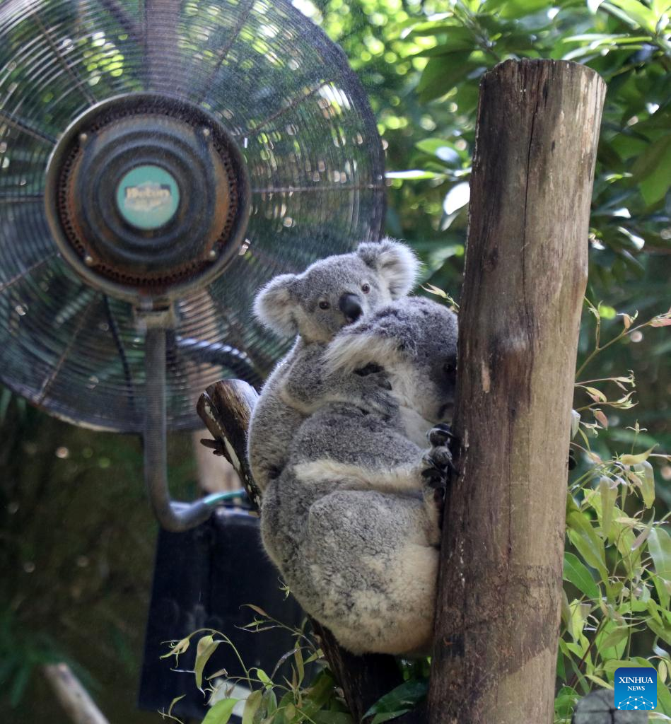 Koalas cool off next to a fan at Chimelong Safari Park in Guangzhou, south China's Guangdong Province, July 22, 2022. The zoo tries every means to help animals fend off the summer heat in recent days. (Xinhua/Huang Guobao)