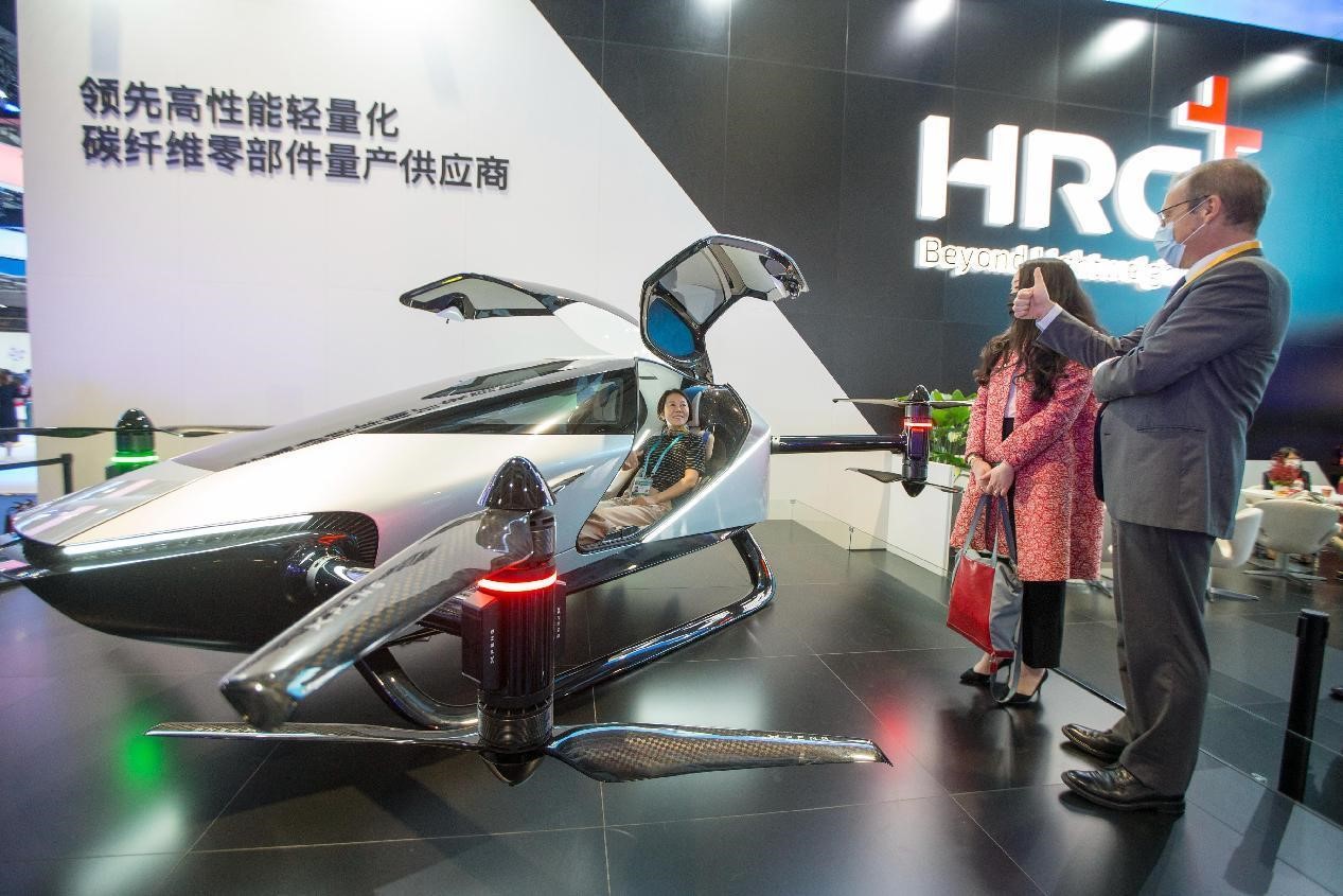 The X2, a flying car from Chinese electric vehicle producer XPeng, is exhibited at the automobile section of the fourth China International Import Expo, Nov. 6, 2021. (People’s Daily Online/ Zhai Huiyong)