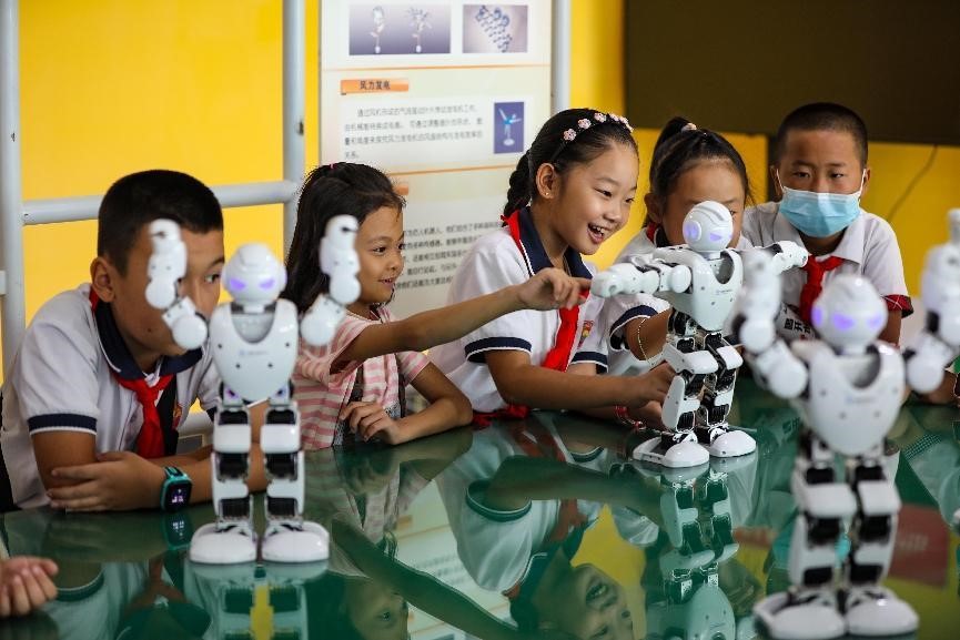 Primary school students watch a robot show at a science and technology museum in Hutubi county, Hui autonomous prefecture of Changji, northwest China's Xinjiang Uygur autonomous region, July 20, 2022. (People's Daily Online/ Wang Junwei)