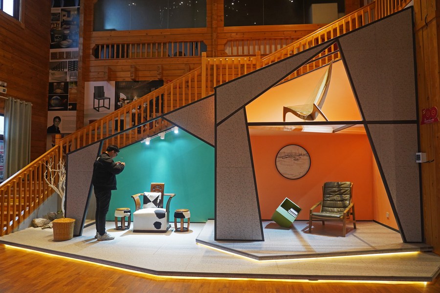 A visitor takes photos of furniture exhibits in Ganzhou, east China's Jiangxi Province, Feb. 18, 2022. (Xinhua/Wan Xiang)
