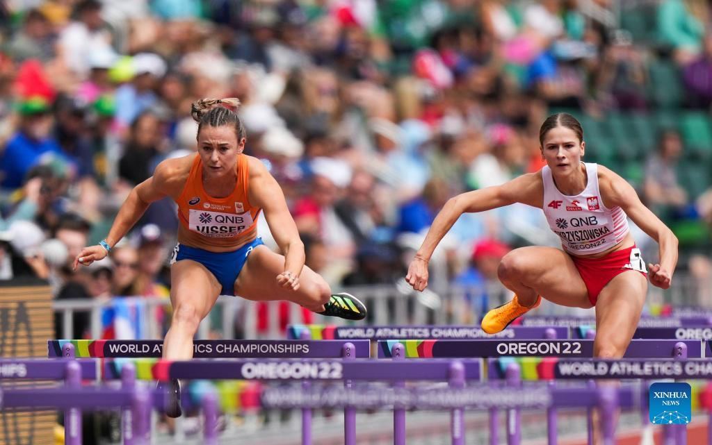 Nadine Visser (L) of the Netherlands competes with Poland's Pia Skrzyszowska during the women's 100m hurdles heats at the World Athletics Championships Oregon22 in Eugene, Oregon, the United States, July 23, 2022. (Xinhua/Wang Ying)