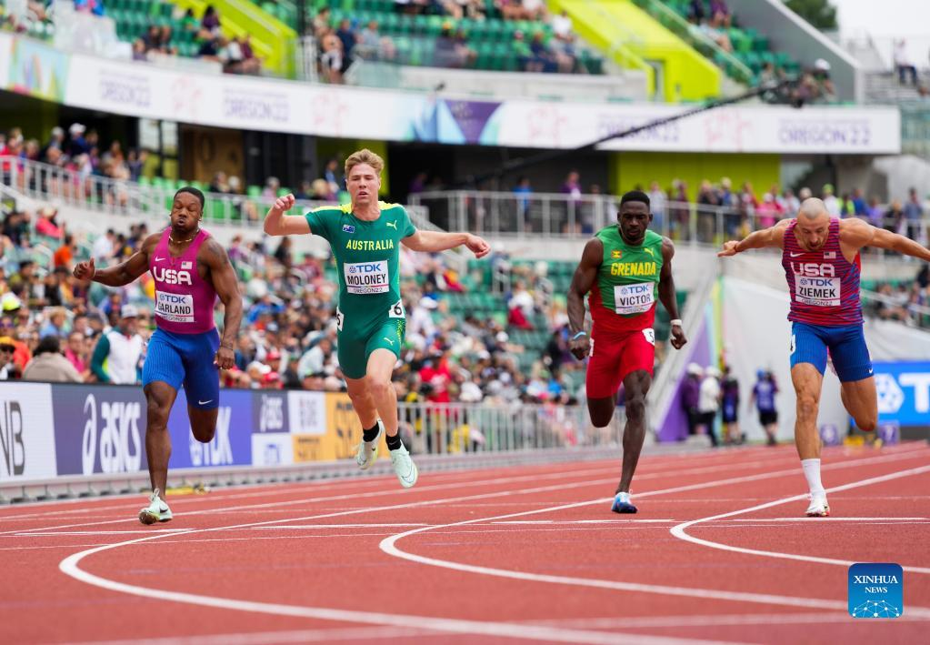 (L to R) Kyle Garland of the United States, Australia's Ashley Moloney, Grenada's Lindon Victor and Zachery Ziemek of the United States sprint to the finish line during the 100m competition of the Decathlon event at the World Athletics Championships Oregon22 in Eugene, Oregon, the United States, July 23, 2022. (Xinhua/Wang Ying)