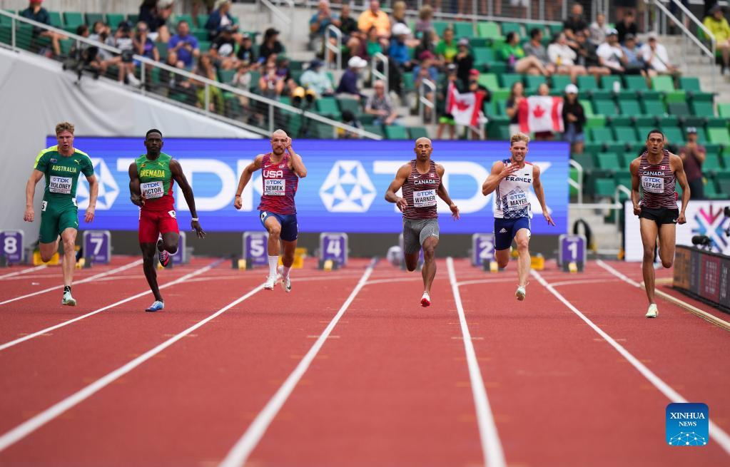 (L to R) Australia's Ashley Moloney, Grenada's Lindon Victor, Zachery Ziemek of the United States, Canada's Damian Warner, France's Kevin Mayer and Canada's Pierce Lepage compete during the 100m competition of the Decathlon event at the World Athletics Championships Oregon22 in Eugene, Oregon, the United States, July 23, 2022. (Xinhua/Wang Ying)