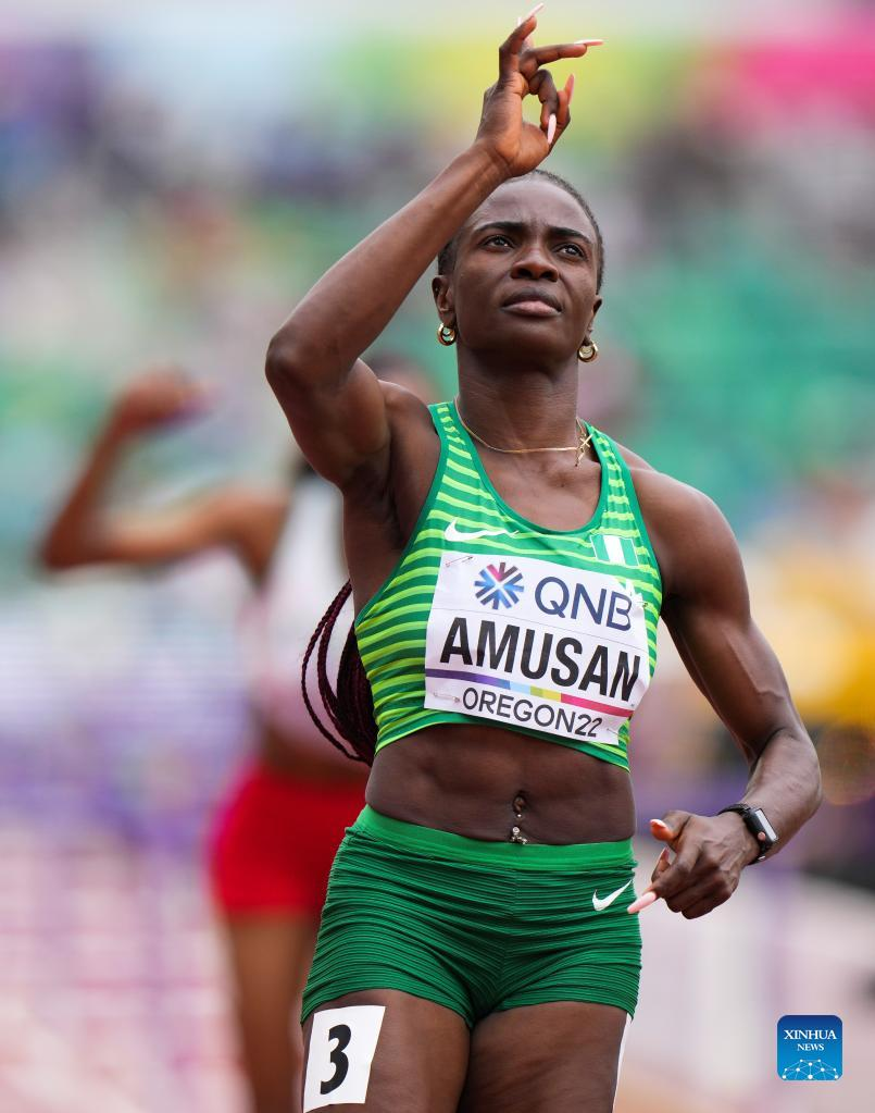Nigeria's Tobi Amusan reacts after the women's 100m hurdles heats at the World Athletics Championships Oregon22 in Eugene, Oregon, the United States, July 23, 2022. (Xinhua/Wang Ying)