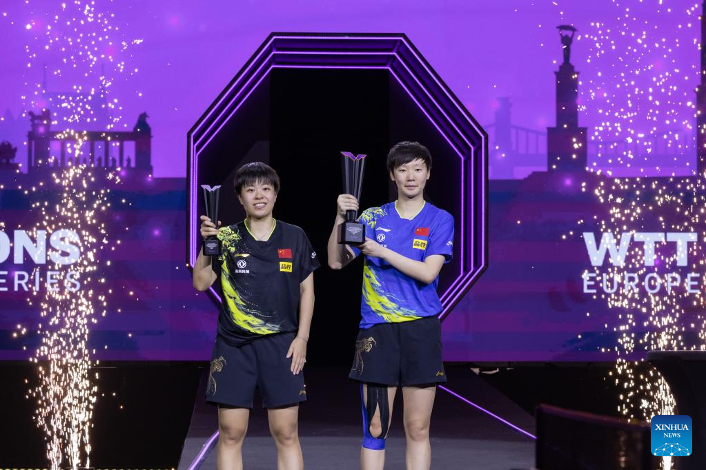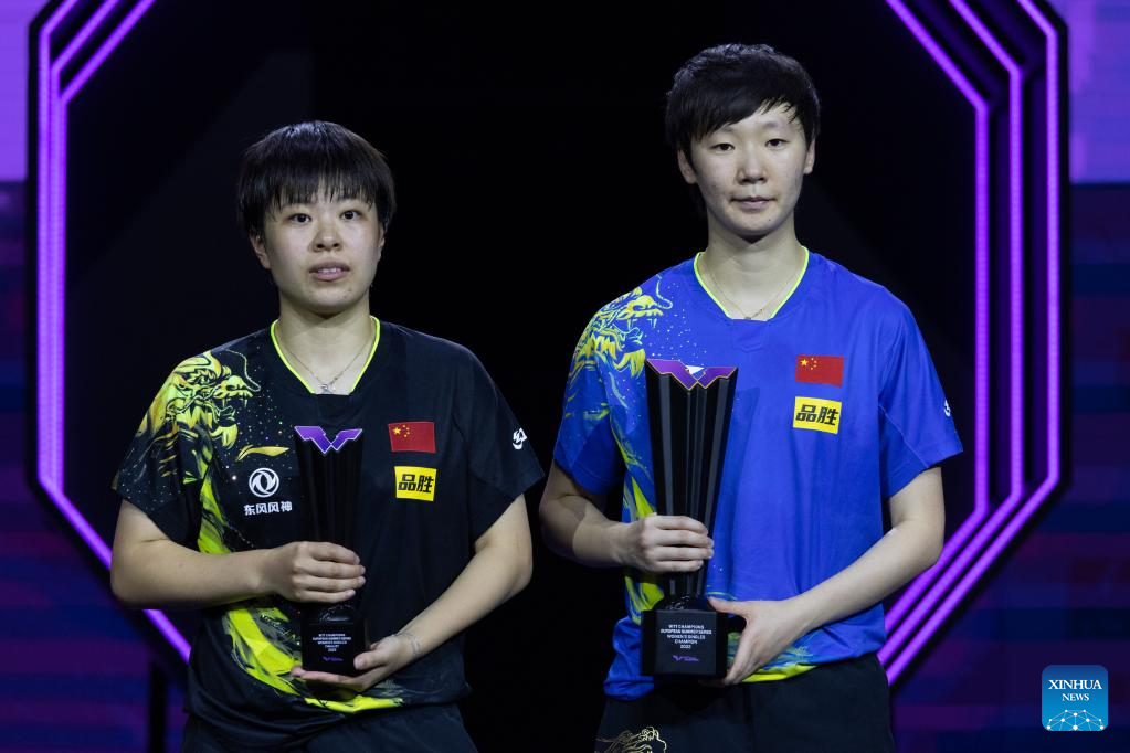 First-placed Wang Manyu (R) of China and second-placed Wang Yidi of China pose for photos during the awarding ceremony for the women's singles event at the World Table Tennis(WTT) Champions European Summer Series 2022 in Budapest, Hungary, on July 23, 2022. (Photo by Attila Volgyi/Xinhua)