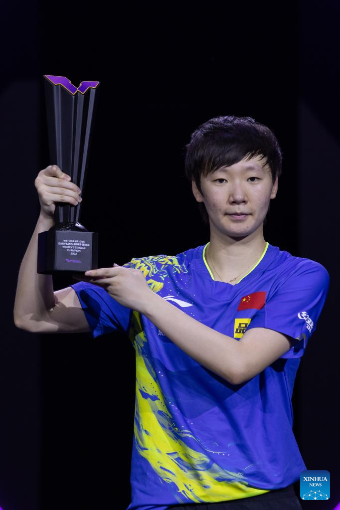 First-placed Wang Manyu of China poses for photos during the awarding ceremony of the women's singles event at the World Table Tennis(WTT) Champions European Summer Series 2022 in Budapest, Hungary, on July 23, 2022. (Photo by Attila Volgyi/Xinhua)