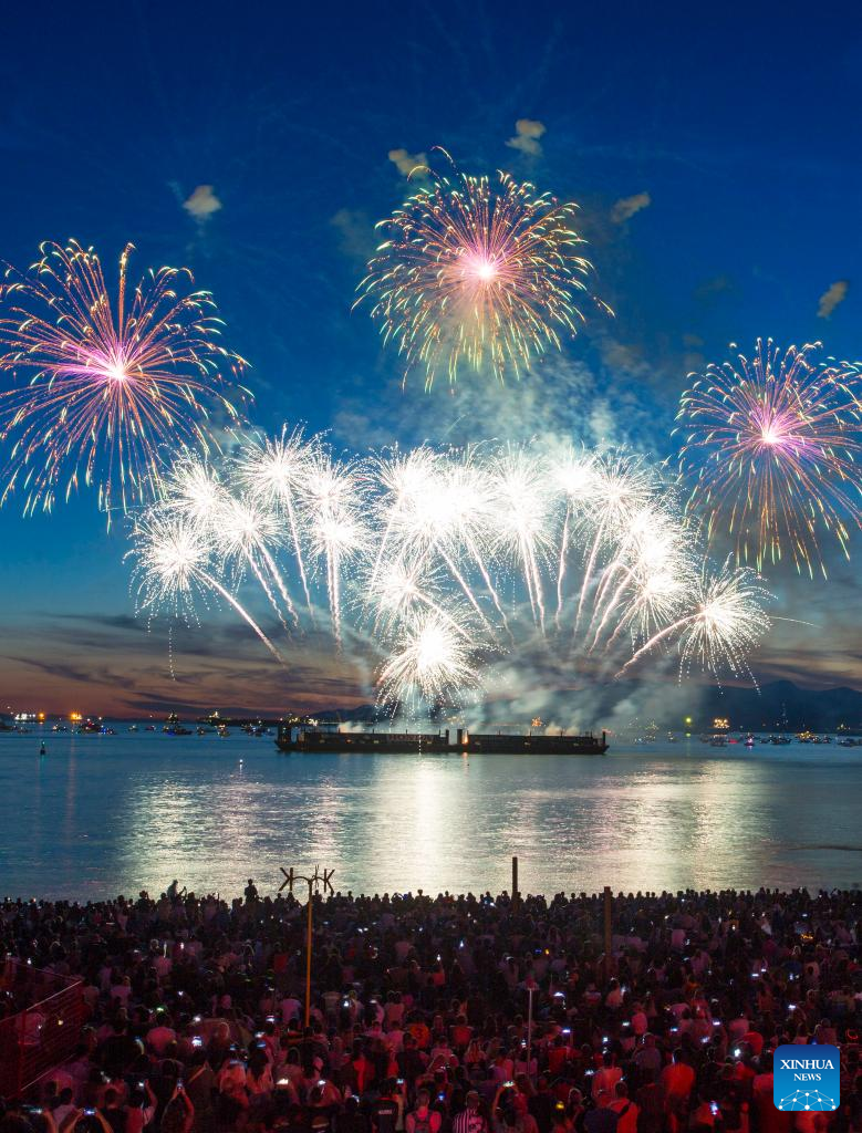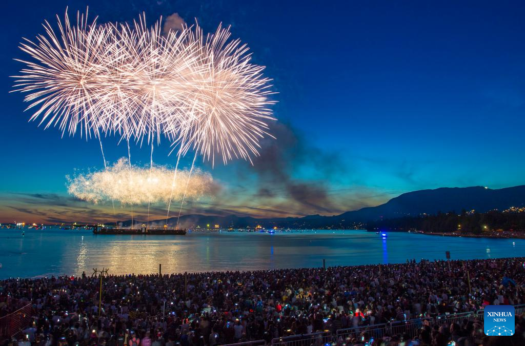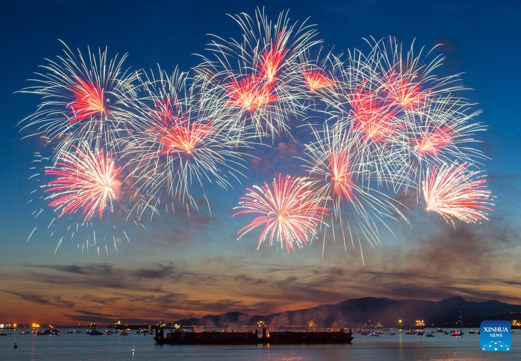 Fireworks presented by team Japan light up the sky during the 30th annual Celebration of Light at English Bay in Vancouver, British Columbia, Canada, on July 23, 2022. The 30th Celebration of Light fireworks competition kicked off by team Japan on Saturday, followed by team Canada on July 27 and team Spain on July 30. (Photo by Liang Sen/Xinhua)