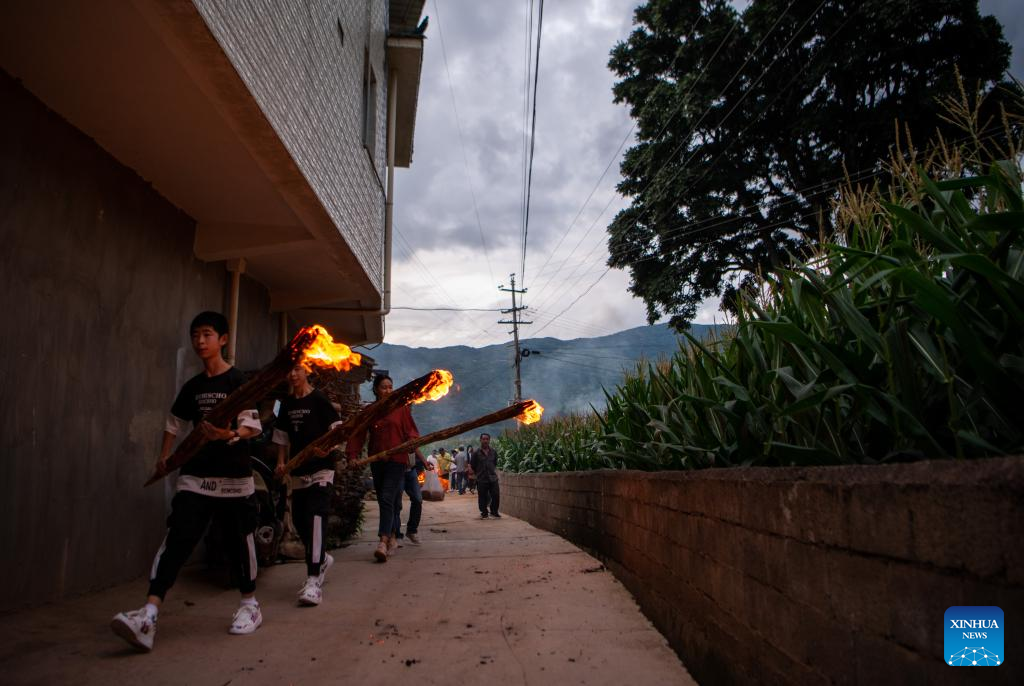 Villagers light up torches to celebrate a torch festival in Taiping Village in Nanjian Yi Autonomous County, southwest China's Yunnan Province, July 23, 2022. (Xinhua/Jiang Wenyao)