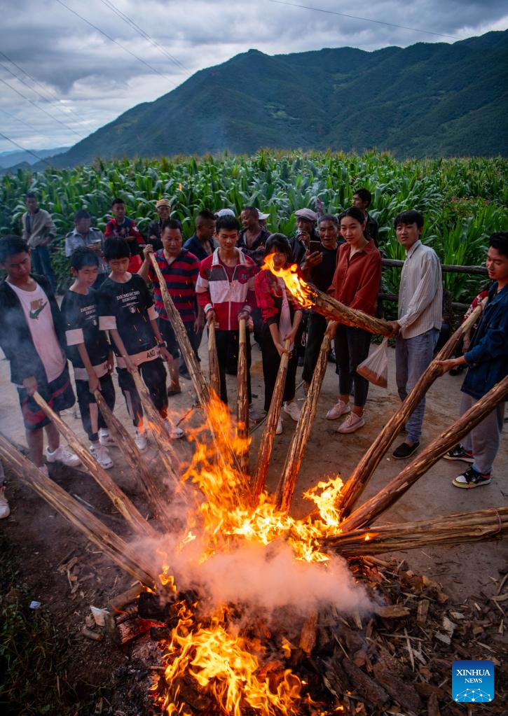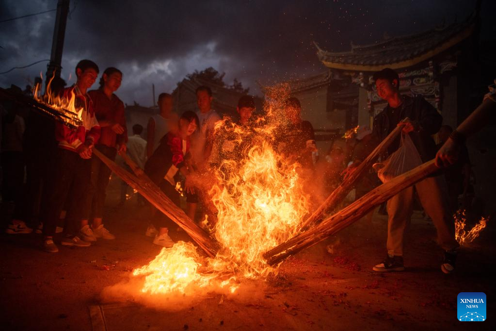 Villagers attend a celebration of a torch festival in Taiping Village in Nanjian Yi Autonomous County, southwest China's Yunnan Province, July 23, 2022. (Xinhua/Jiang Wenyao)