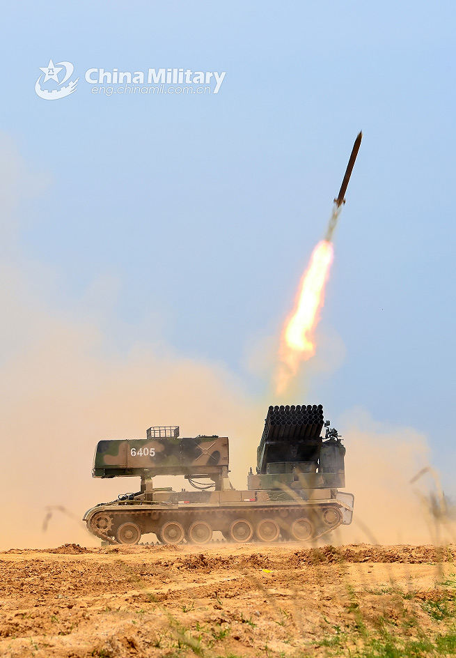 A self-propelled rocket launcher attached to an artillery detachment of a brigade of the 71st Group Army under the PLA Eastern Theater Command fires rocket at mock target in a live-fire tactical drill on June 9, 2022. (eng.chinamil.com.cn/Photo by Li Zheng)