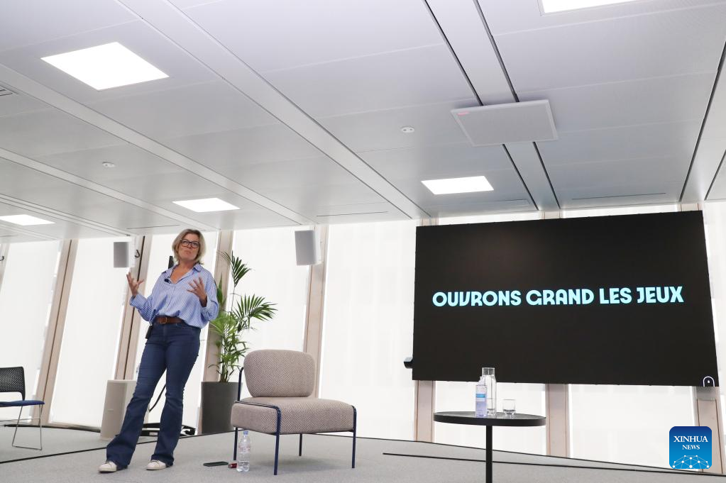 Paris 2024 Brand Director Julie Matikhine speaks during a press conference in Paris, France, July 25, 2022. With two years to go to the opening ceremony of the 2024 Paris Olympic Games, organizers on Monday revealed "Ouvrons Grand Les Jeux", meaning "Games Wide Open", as the official slogan for the Paris Olympic and Paralympic Games. (Xinhua/Gao Jing)