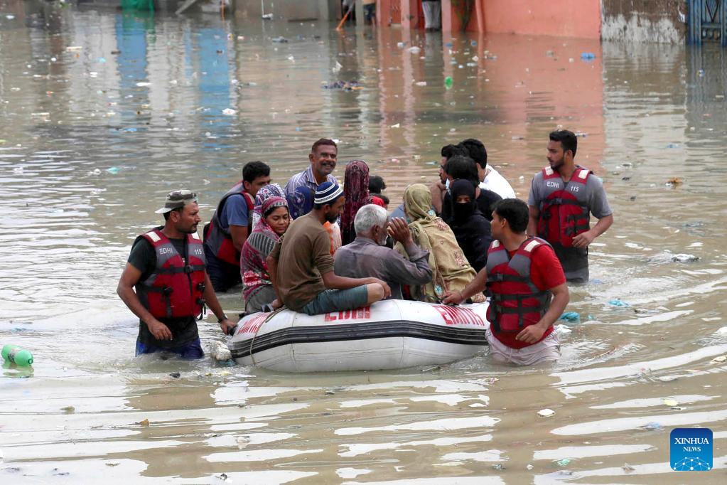 Rescuers evacuate people from a flooded area after heavy rain in southern Pakistani port city of Karachi, on July 25, 2022. Around 310 people have been killed and 295 others injured in separate rain-related incidents in Pakistan since June 14 as heavy downpours continued to lash the country, the National Disaster Management Authority (NDMA) said. (Str/Xinhua)