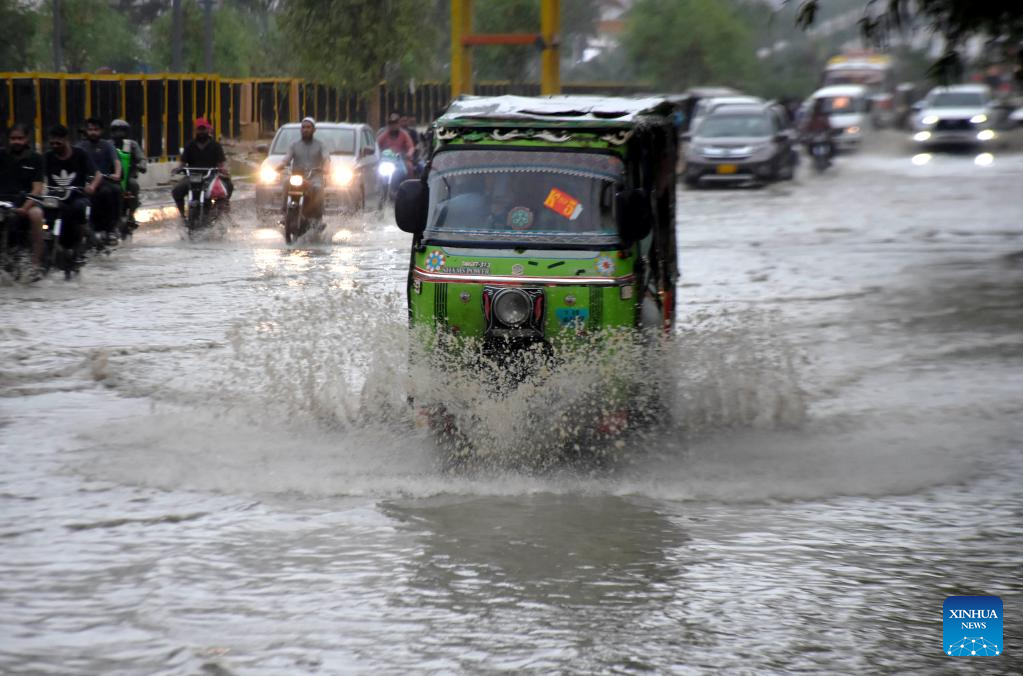 Vehicles run on a flooded road after heavy rain in southern Pakistani port city of Karachi, on July 25, 2022. Around 310 people have been killed and 295 others injured in separate rain-related incidents in Pakistan since June 14 as heavy downpours continued to lash the country, the National Disaster Management Authority (NDMA) said. (Str/Xinhua)