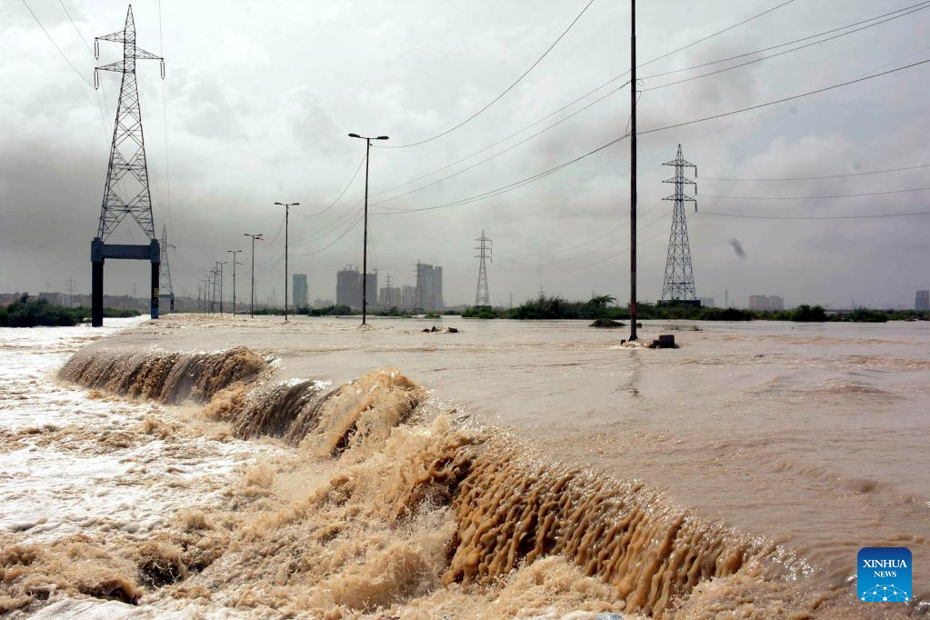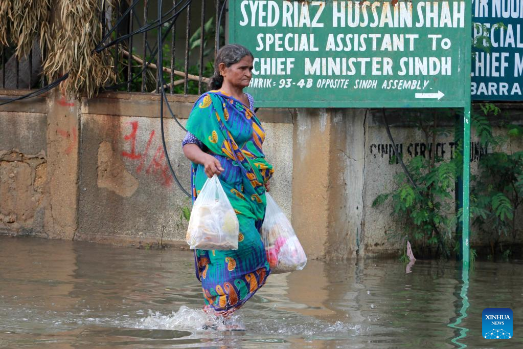 Photo taken on July 25, 2022 shows a flooded area after heavy rain in southern Pakistani port city of Karachi. Around 310 people have been killed and 295 others injured in separate rain-related incidents in Pakistan since June 14 as heavy downpours continued to lash the country, the National Disaster Management Authority (NDMA) said. (Str/Xinhua)