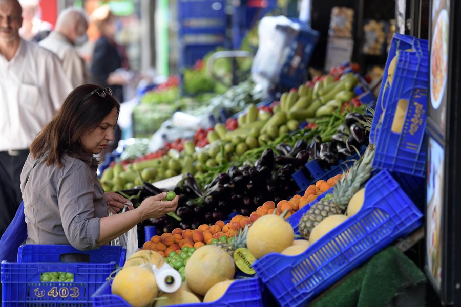 A customer purchases vegetables at a stall in Istanbul, Turkey, May 26, 2022. (Xinhua/Shadati)