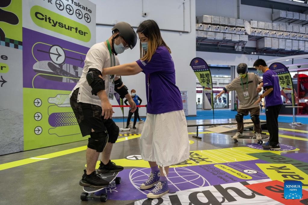 Visitors experience surfskate at the second China International Consumer Products Expo (CICPE) in Haikou, south China's Hainan Province, July 26, 2022. The six-day expo, which kicked off on Monday in Haikou, has attracted 1,107 overseas companies and 1,643 brands from 61 countries and regions, as well as over 1,200 domestic brands.