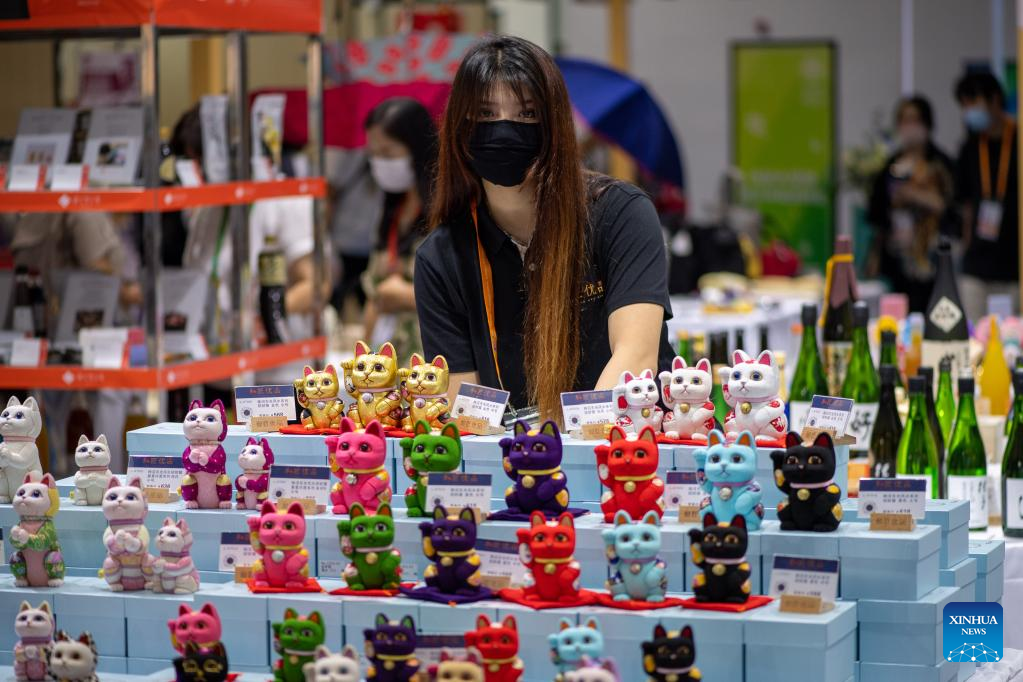 An exhibitor works at her booth at the second China International Consumer Products Expo (CICPE) in Haikou, south China's Hainan Province, July 26, 2022. The six-day expo, which kicked off on Monday in Haikou, has attracted 1,107 overseas companies and 1,643 brands from 61 countries and regions, as well as over 1,200 domestic brands.