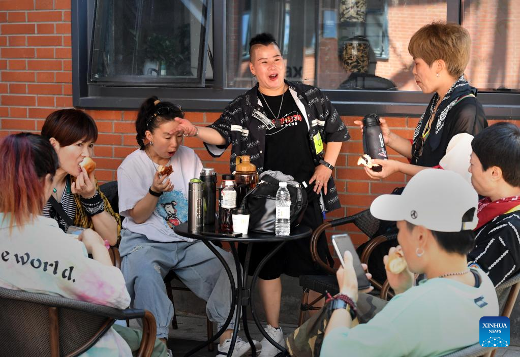 Members of Huo Mei Gui dance group have a rest during the street dance practice in Zhengzhou, central China's Henan Province, July 21, 2022. In Zhengzhou, central China's Henan Province, there is a female street dance group Huo Mei Gui (meaning Fire Rose). Founded in 2008, the group now has 16 members of 45 to 71 years old.
