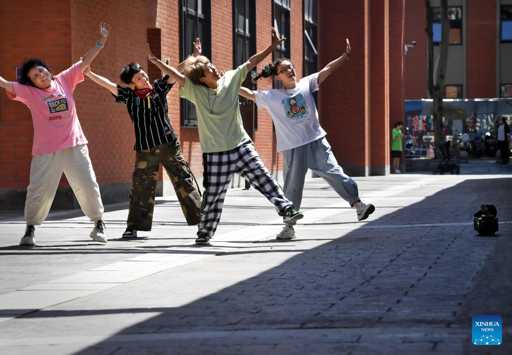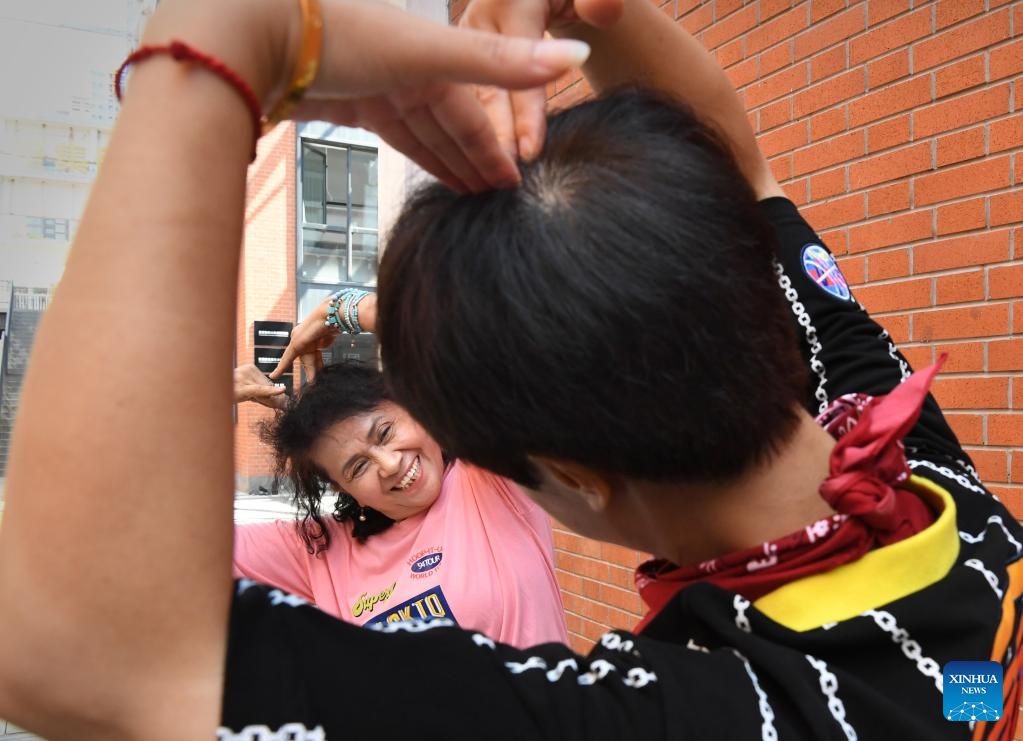 Yu Qinhua (L) and Zhou Fang of Huo Mei Gui dance group practice in Zhengzhou, central China's Henan Province, July 21, 2022. In Zhengzhou, central China's Henan Province, there is a female street dance group Huo Mei Gui (meaning Fire Rose). Founded in 2008, the group now has 16 members of 45 to 71 years old.