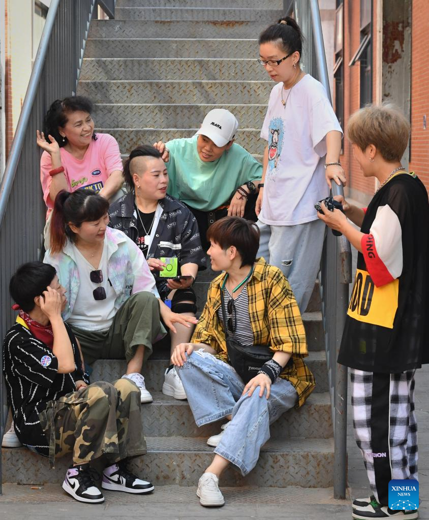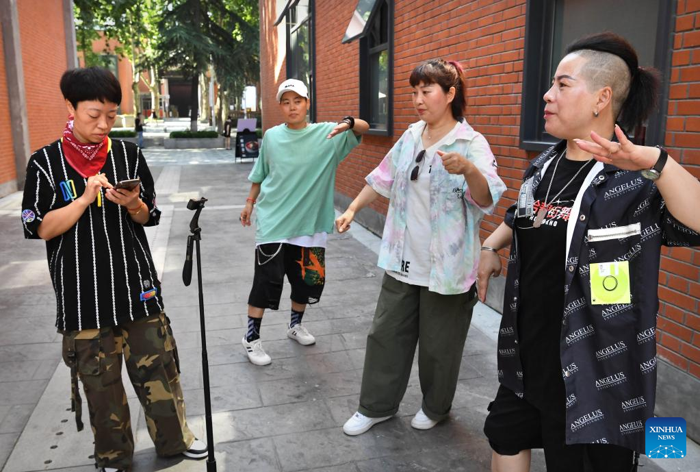 Members of Huo Mei Gui dance group prepare to take video clips in Zhengzhou, central China's Henan Province, July 21, 2022. In Zhengzhou, central China's Henan Province, there is a female street dance group Huo Mei Gui (meaning Fire Rose). Founded in 2008, the group now has 16 members of 45 to 71 years old.