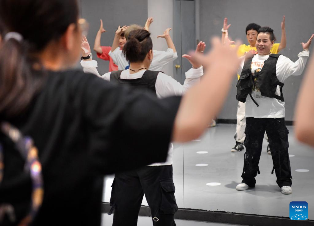 Ma Gaixiang (R) of Huo Mei Gui dance group practices at a street dance studio in Zhengzhou, central China's Henan Province, July 19, 2022. In Zhengzhou, central China's Henan Province, there is a female street dance group Huo Mei Gui (meaning Fire Rose). Founded in 2008, the group now has 16 members of 45 to 71 years old.