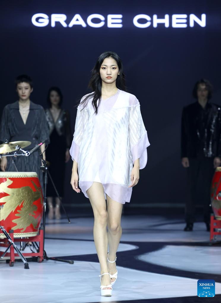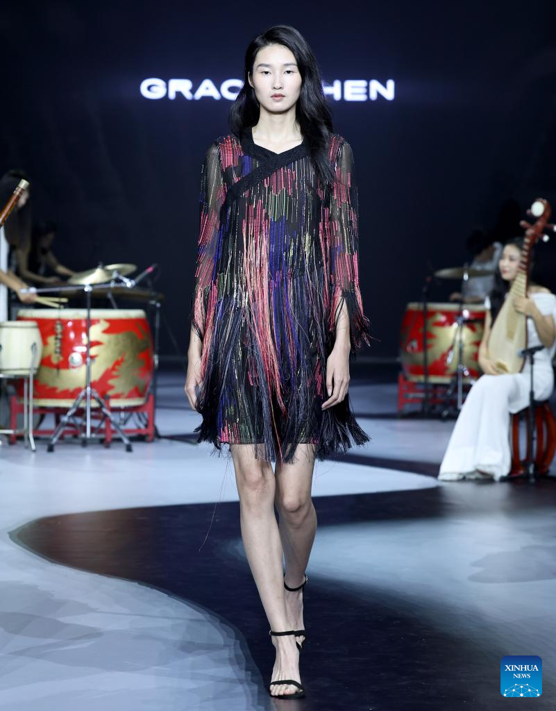 A model presents a creation of designer Grace Chen during a fashion week at the second China International Consumer Products Expo (CICPE) in Haikou, south China's Hainan Province, on July 26, 2022. (Xinhua/Chen Jianli)